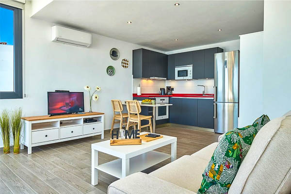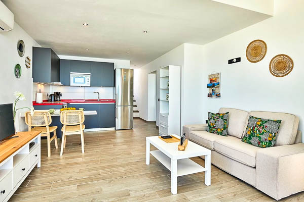 Bright, modern living room with sofa, dining table and open kitchen, one bedroom with double bed and one bathroom with shower, approx. 60 square metres of living space.