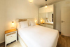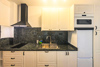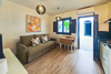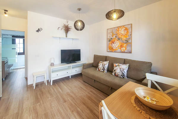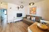 Living room with sofa, dining table and integrated kitchen, one bedroom with double bed (190 x 150 cm) and one bathroom with shower, bright and friendly furnishings.